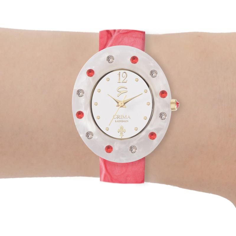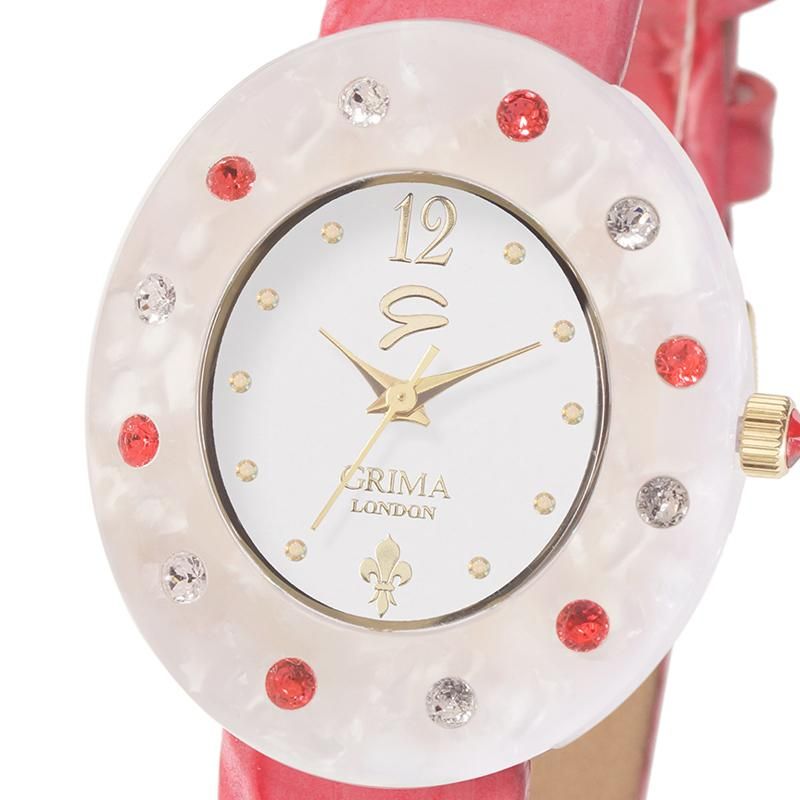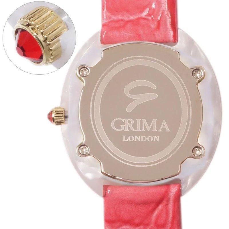 イタリア貴族出身のデザイナー、グリマが選び抜いた天然由来の樹脂を使用し、上品なオーバル(楕円)型に仕上げ、デザイン性だけでなく、肌に優しいのも特徴。天然樹脂の美しさを生かしつつ、スワロフスキーのクリスタルガラスとの組み合わせが独創的な美しさを演出。ロンドン育ちのグリマの恵まれた感性で、エレガントな文字盤のデザインに、インデックス(時刻を表す数字)部分や竜頭の先端にも全体を引き立たせるクリスタルガラスをさりげなくあしらっています。