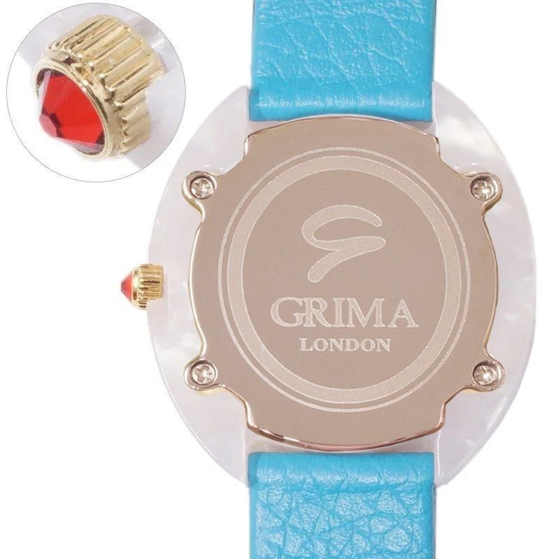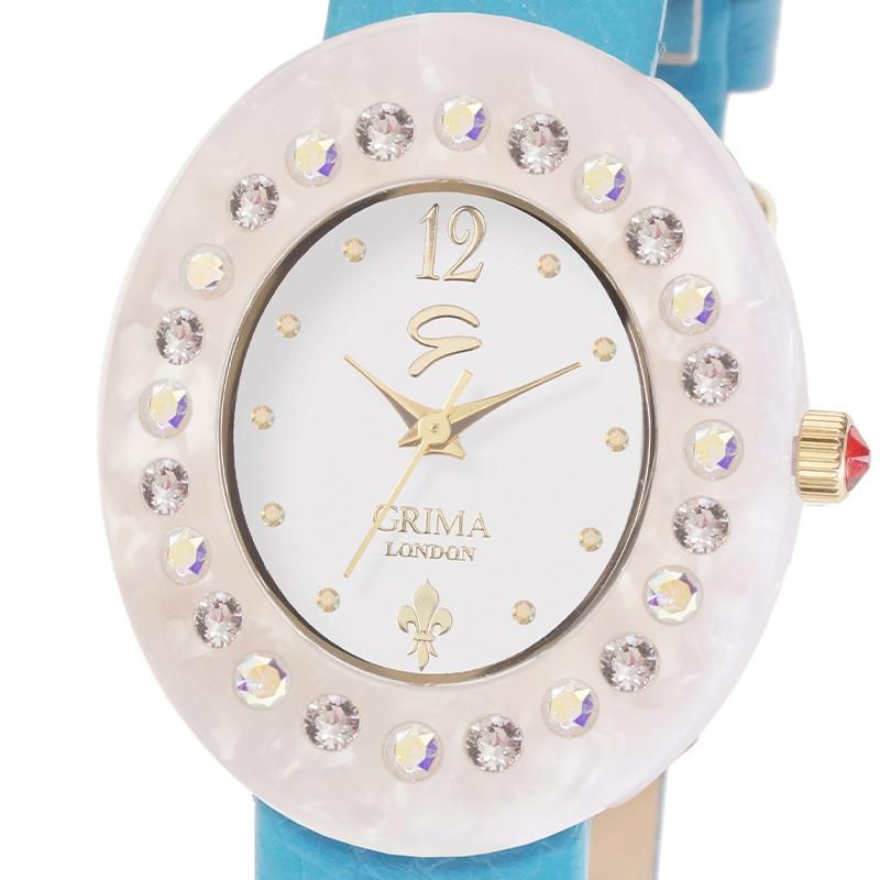 イタリア貴族出身のデザイナー、グリマが選び抜いた天然由来の樹脂を使用し、上品なオーバル(楕円)型に仕上げ、デザイン性だけでなく、肌に優しいのも特徴。天然樹脂の美しさを生かしつつ、ふんだんにあしらったスワロフスキーのクリスタルガラスとの組み合わせが独創的な美しさを演出。ロンドン育ちのグリマの恵まれた感性で、エレガントな文字盤のデザインに、インデックス(時刻を表す数字)部分や竜頭の先端にも全体を引き立たせるクリスタルガラスをさりげなくあしらっています。