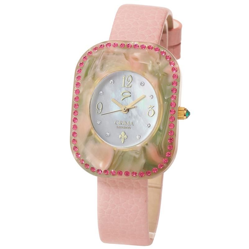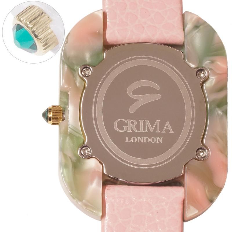 上品なカーブのついた長方形の本体部分にはイタリア製の天然樹脂を使用しており、自然に彩られた美しさを生かしつつ、贅沢にあしらったスワロフスキーのクリスタルガラスとの組み合わせが独創的な美しさを演出。イタリア貴族出身のグリマならではのエレガントな文字盤のデザインには厳選した白蝶貝を使用。インデックス(時刻を表す数字)部分や竜頭の先端にも全体を引き立たせるクリスタルガラスをさりげなくあしらい艶やかな仕上がりです。