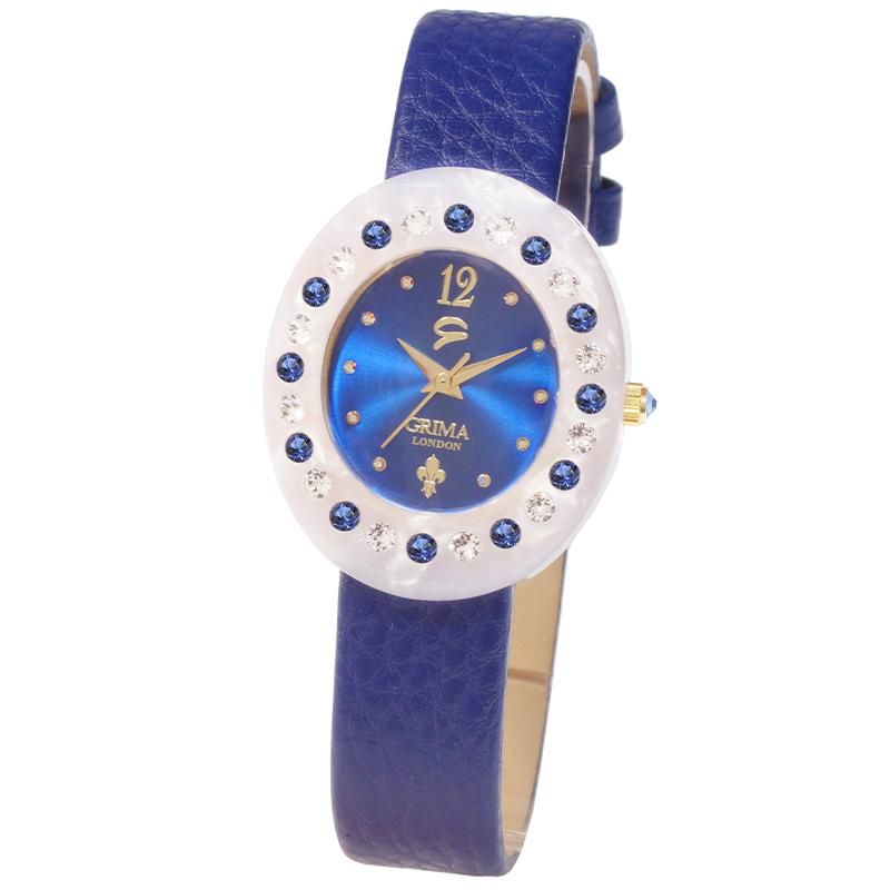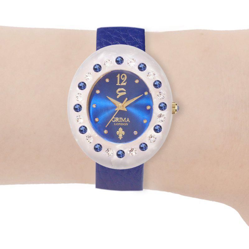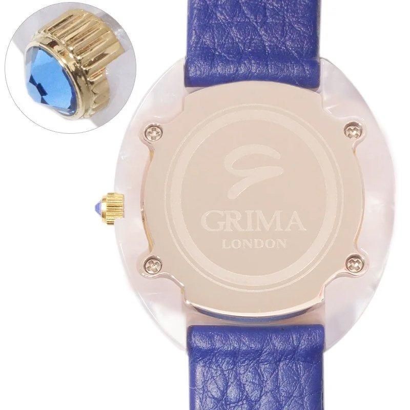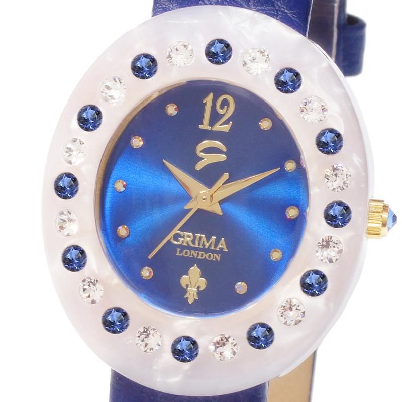 イタリア貴族出身のデザイナー、グリマが選び抜いた天然由来の樹脂を使用し、上品なオーバル(楕円)型に仕上げ、デザイン性だけでなく、肌に優しいのも特徴。天然樹脂の美しさを生かしつつ、ふんだんにあしらったスワロフスキーのクリスタルガラスとの組み合わせが独創的な美しさを演出。ロンドン育ちのグリマの恵まれた感性で、エレガントな文字盤のデザインに、インデックス(時刻を表す数字)部分や竜頭の先端にも全体を引き立たせるクリスタルガラスをさりげなくあしらっています。