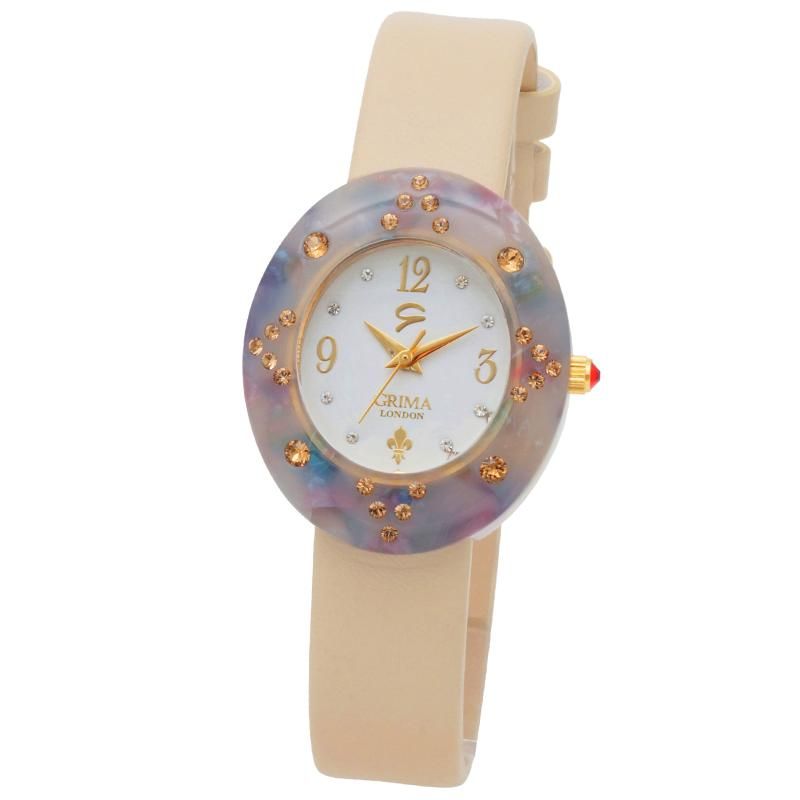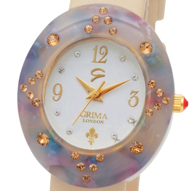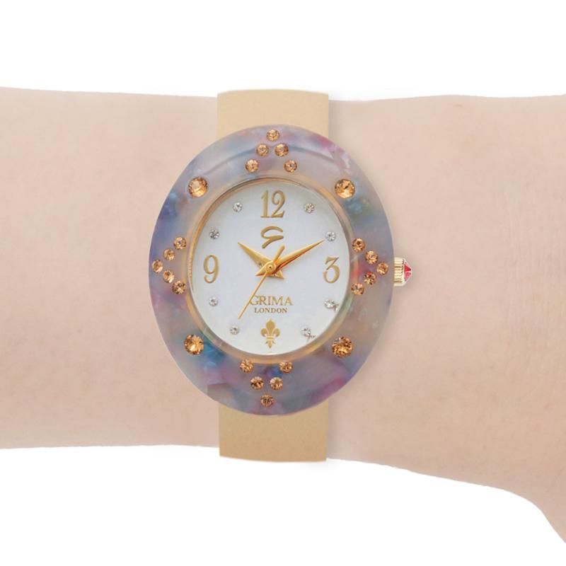 上品で落ち着いたシャンパンカラーのサイズの異なるストーンを融合させて贅沢な仕上がりに。ベルトは少し艶感があり落ち着いた印象に。ホワイト文字盤を取り入れることで、ボディ部分が際立つ美しさを醸し出します。オールシーズンつけられるカラーにも仕上がっています。