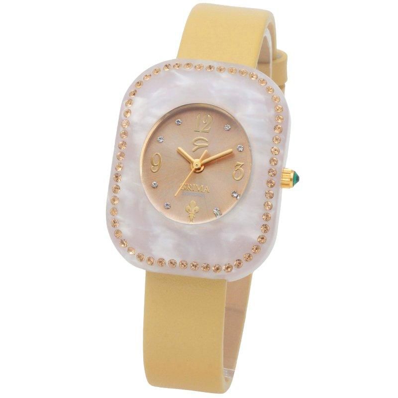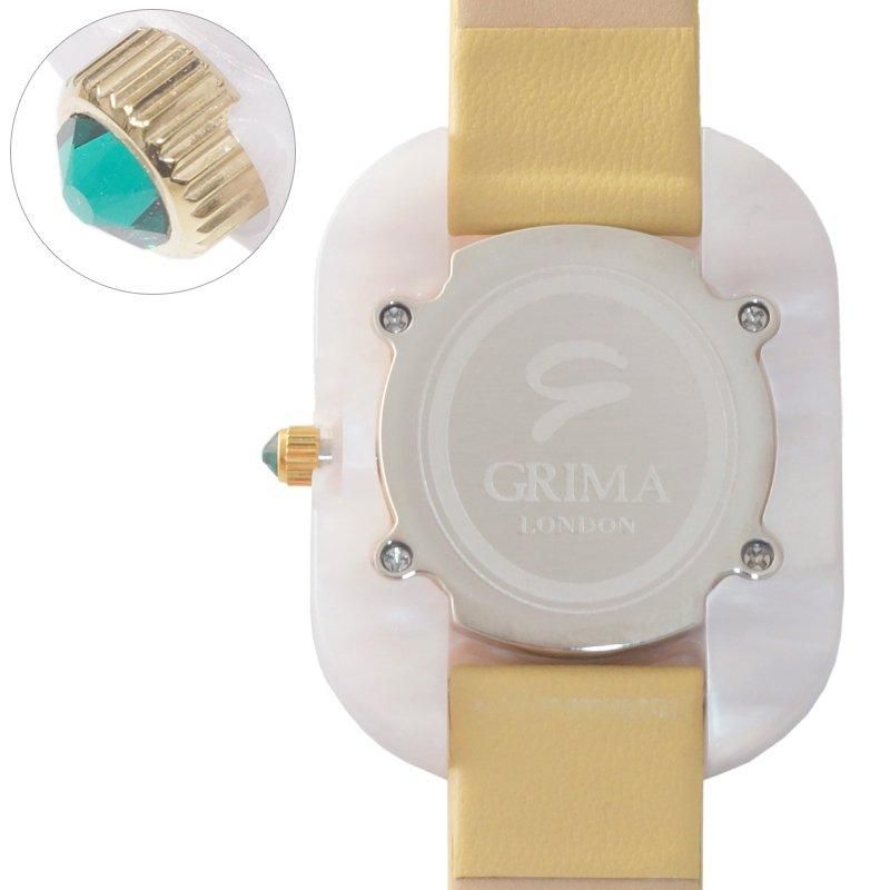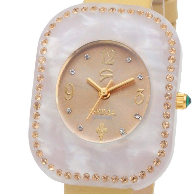 ロンドン育ちのグリマの恵まれた感性で、エレガントな文字盤のデザインに、インデックス(時刻を表す数字)部分や竜頭の先端にも全体を引き立たせるクリスタルガラスをさりげなくあしらっています。