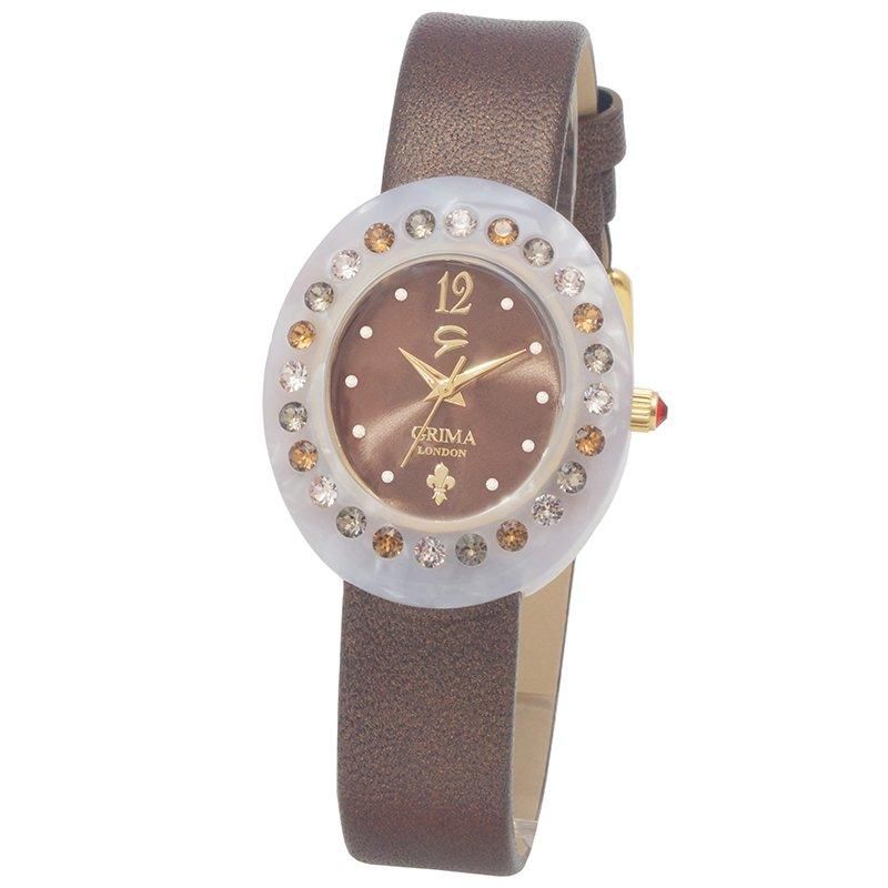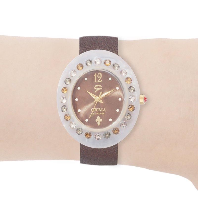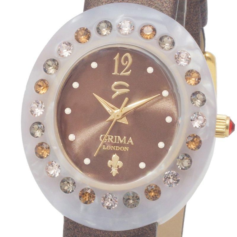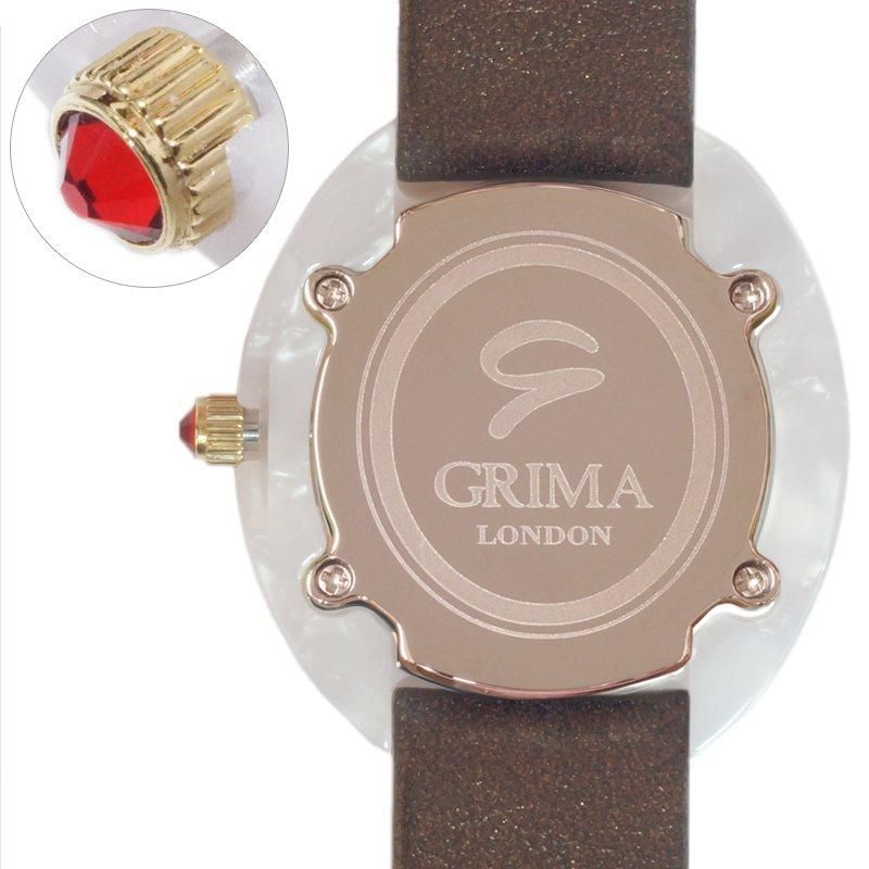 イタリア貴族出身のデザイナー、グリマが選び抜いた天然由来の樹脂を使用し、上品なオーバル(楕円)型に仕上げ、デザイン性だけでなく、肌に優しいのも特徴。天然樹脂の美しさを生かしつつ、ふんだんにあしらったスワロフスキーのクリスタルガラスとの組み合わせが独創的な美しさを演出。ロンドン育ちのグリマの恵まれた感性で、エレガントな文字盤のデザインに、インデックス(時刻を表す数字)部分や竜頭の先端にも全体を引き立たせるクリスタルガラスをさりげなくあしらっています。