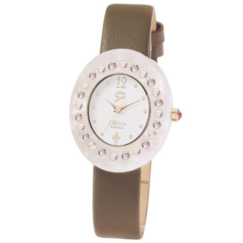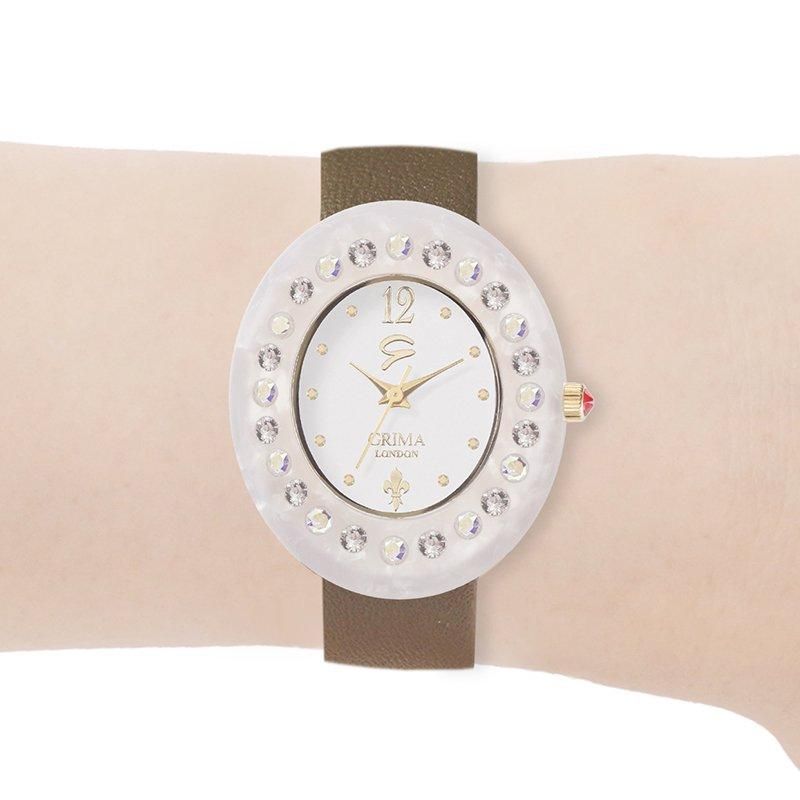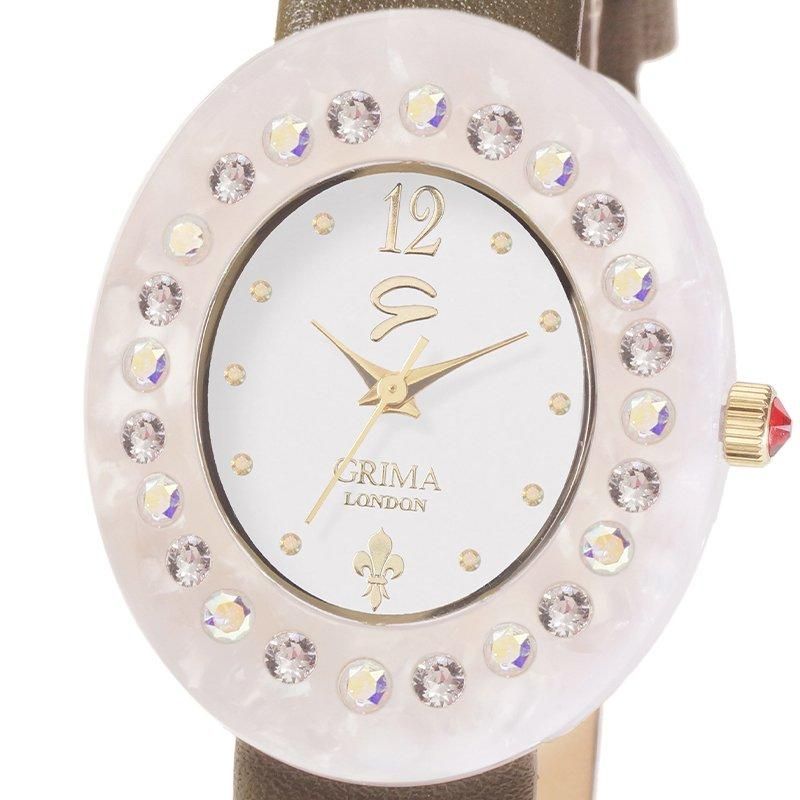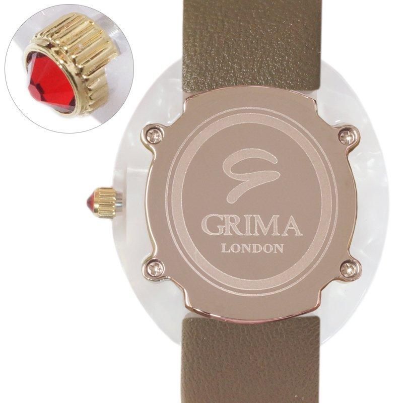 イタリア貴族出身のデザイナー、グリマが選び抜いた天然由来の樹脂を使用し、上品なオーバル(楕円)型に仕上げ、デザイン性だけでなく、肌に優しいのも特徴。天然樹脂の美しさを生かしつつ、ふんだんにあしらったスワロフスキーのクリスタルガラスとの組み合わせが独創的な美しさを演出。ロンドン育ちのグリマの恵まれた感性で、エレガントな文字盤のデザインに、インデックス(時刻を表す数字)部分や竜頭の先端にも全体を引き立たせるクリスタルガラスをさりげなくあしらっています。