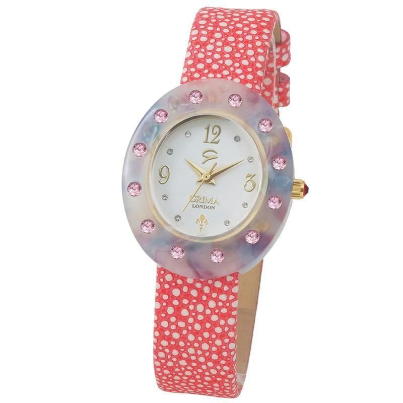 イタリア貴族出身のデザイナー、グリマが選び抜いた天然由来の樹脂を使用し、上品なオーバル(楕円)型に仕上げ、デザイン性だけでなく、肌に優しいのも特徴。1点ずつ異なる天然樹脂の美しさを生かしつつ、ふんだんにあしらったスワロフスキーのクリスタルガラスとの組み合わせが独創的な美しさを演出。ロンドン育ちのグリマの恵まれた感性で、エレガントな文字盤のデザインに、インデックス(時刻を表す数字)部分や竜頭の先端にも全体を引き立たせるクリスタルガラスをさりげなくあしらっています。