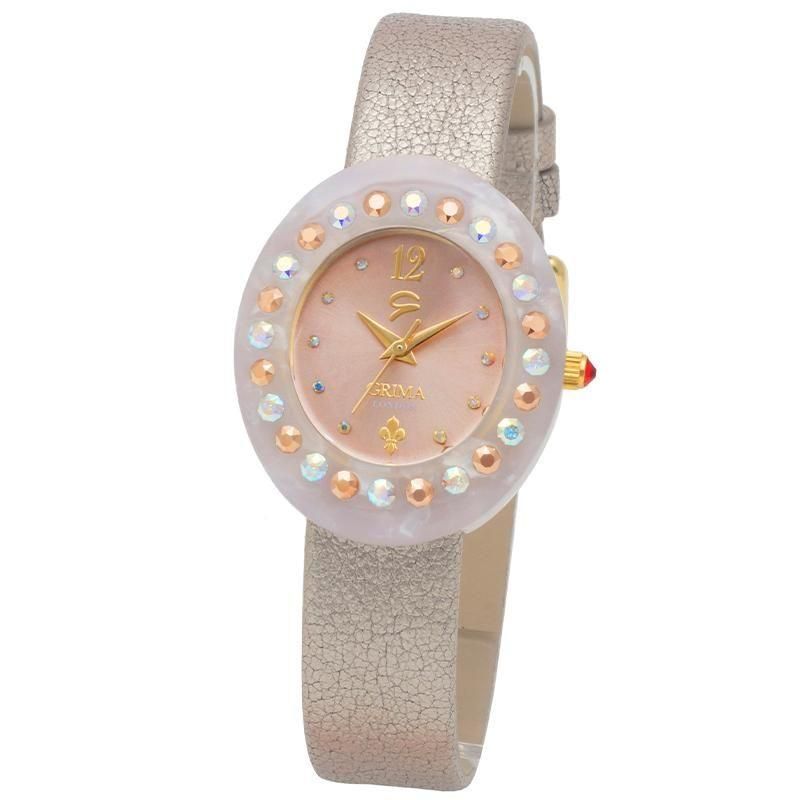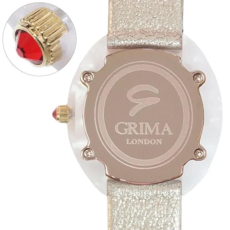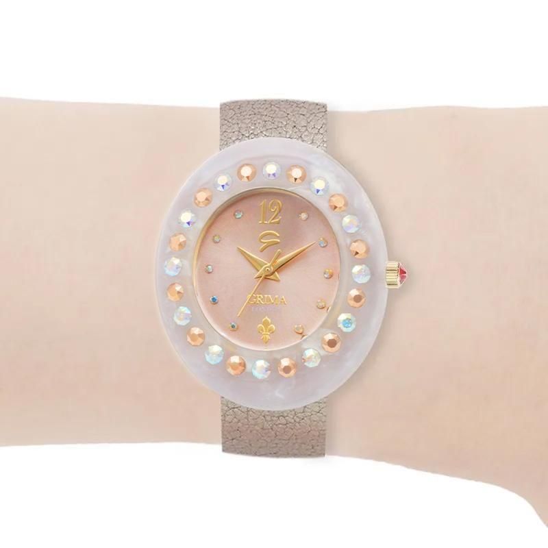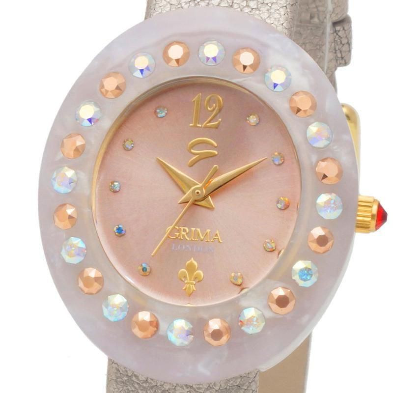 イタリア貴族出身のデザイナー、グリマが選び抜いた天然由来の樹脂を使用し、上品なオーバル(楕円)型に仕上げ、デザイン性だけでなく、肌に優しいのも特徴。天然樹脂の美しさを生かしつつ、ふんだんにあしらったスワロフスキーのクリスタルガラスとの組み合わせが独創的な美しさを演出。ロンドン育ちのグリマの恵まれた感性で、エレガントな文字盤のデザインに、インデックス(時刻を表す数字)部分や竜頭の先端にも全体を引き立たせるクリスタルガラスをさりげなくあしらっています。