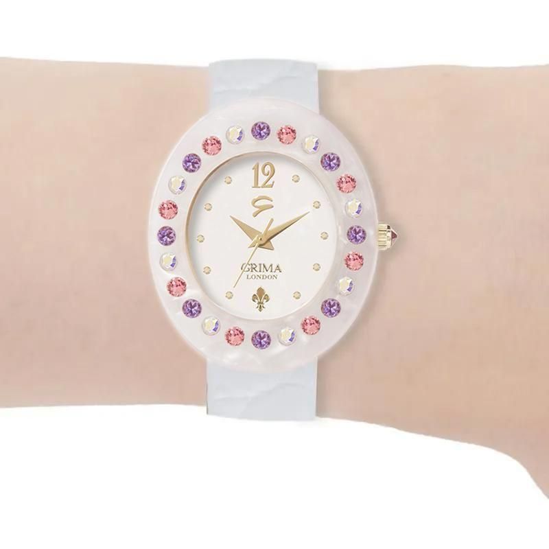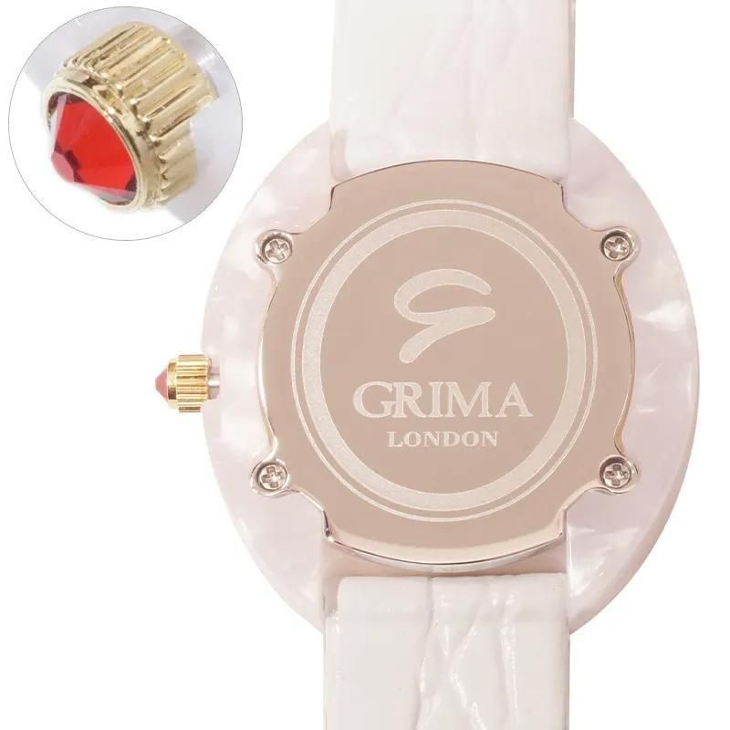 イタリア貴族出身のデザイナー、グリマが選び抜いた天然由来の樹脂を使用し、上品なオーバル(楕円)型に仕上げ、デザイン性だけでなく、肌に優しいのも特徴。天然樹脂の美しさを生かしつつ、ふんだんにあしらったスワロフスキーのクリスタルガラスとの組み合わせが独創的な美しさを演出。ロンドン育ちのグリマの恵まれた感性で、エレガントな文字盤のデザインに、インデックス(時刻を表す数字)部分や竜頭の先端にも全体を引き立たせるクリスタルガラスをさりげなくあしらっています。